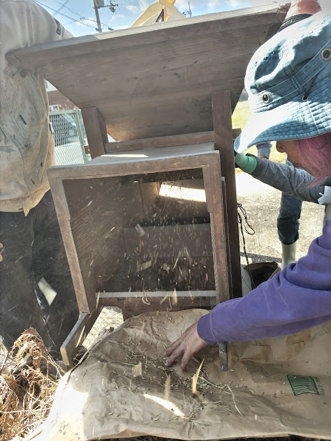 唐箕で藁と実を分けます。